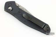 This Osborne designed Benchmade features a stonewashed plain edge blade, black aluminum handle, tip up reversible stainless steel clip. Axis lock mechanism. Comes with original box, papers and drawstring pouch. Has a couple light scuffs, otherwise excellent condition.