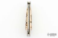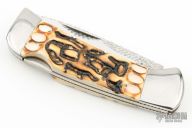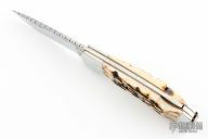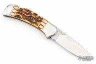 This lockback by "Hale" (please let us know if you know which Hale this is) features a satin finished blade with textured flats and fileworked spine, has nail nick. The handle has stainless steel bolsters, jigged bone scales, fileworked brass liners, steel backspacer. Has a couple light scratches, otherwise excellent condition.