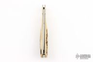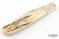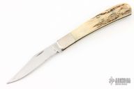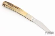 This slipjoint by John Wilkes features a satin finished blade with nail nick. The handle has dovetailed nickel silver bolsters, stag scales, nickel silver liners, stainless steel spring. Has some scratches, otherwise good condition.