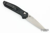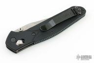 This Osborne designed Benchmade features a stonewashed plain edge blade, black aluminum handle, tip up reversible stainless steel clip. Axis lock mechanism. Comes with wrong BM box, papers and drawstring pouch. Has a couple light scuffs, otherwise excellent condition.