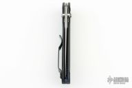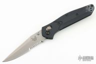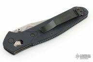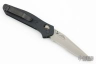 This Osborne designed Benchmade features a stonewashed partially serrated edge blade, black aluminum handle, tip up reversible stainless steel clip. Axis lock mechanism. Comes with wrong BM box, papers and drawstring pouch. Has a couple light scuffs, otherwise excellent condition.