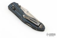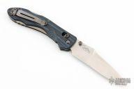 This 930BK Kulgera from Benchmade features a stonewashed recurve blade with swedge and dual thumbstuds. The handle is comprised of blue and black G10 scales over black steel liners and stand-offs. Stainless steel tip up clip is reversible for left or right hand carry. Comes with original box, papers, and drawstring pouch. Has a couple light scuffs and scratches, excellent condition otherwise.