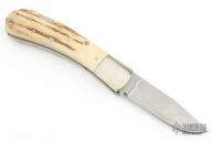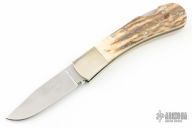 This lockback folder by Mel Pardue features a hand rub satin finished blade. The handle has nickel silver bolsters and liners, stag scales, stainless steel and nickel silver backspacer. Nice lockup and blade seating. #057 on blade. Has a couple light scratches, otherwise excellent condition.