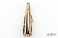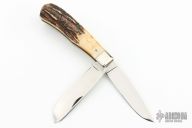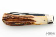 This knife by Aurum features mirror polished blades with nail nicks. The handle has nickel silver bolsters, stag covers, brass liners, stainless steel springs. Has a few light scratches, otherwise excellent condition.