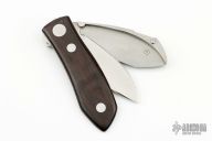 This Barry Wood design swing lock folder features a satin finish blade and satin finish stainless steel frame with wood scales. This is a unique scissor opening folder, which when the blade is fully open and locked in place is almost a fixed blade knife. The handle is nicely contoured for a comfortable grip. Opening is accomplished by lighting pressing down and outward at the rear indentation on the spine, which releases the locking pin and allows one side of the handle and the blade to rotate down then forward until the blade locks in the forward position. The one side of the handle continues to rotate back until it locks in place. Closing requires the same slight thumb pressure at the indentation to release the locking pin, then the one side of the handle is rotated back and around, catching the blade and aligning both with the other side of the handle in a locked closed position. This one doesn't quite lock in the open position, otherwise excellent condition. No markings other than a "B" scribed inside the knife.