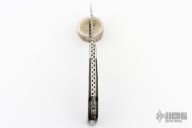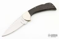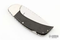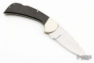 This lockback by Jim Cunningham features a mirror polished blade with fileworked spine. The handle has dovetailed nickel silver bolsters, ebony wood scales, nickel silver liners, fileworked stainless steel backspacer. Has some scratches, has been resharpened, otherwise good condition.