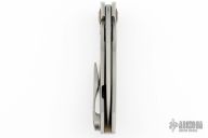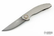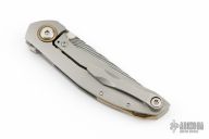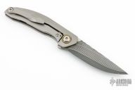 This Orso flipper by Jens Anso features a Takefu San Mai blade with notched flipper. The handle has a fine and checker milled titanium frame, copper backspacer with lanyard hole and pocket clip that is positioned for tip up carry, copper pivot collars, anodized titanium hardware. This piece has a stainless steel lockbar insert and over travel stop. Rides on bearings. Nice detent, lockup and blade seating. Includes a case. Excellent condition.