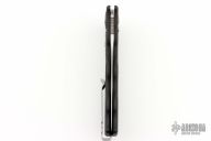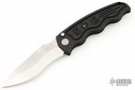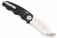 This SOG-TAC Auto has a satin finish recurve blade with notched thumb rest. Handle is black anodized aluminum with safety, lanyard hole, and stainless steel tip up clip - RH/ LH reversible. Comes with original box and papers. Excellent condition.