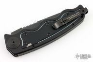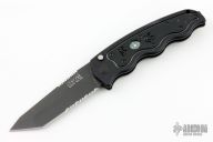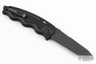This SOG-TAC Auto has a black tanto partially serrated blade with notched thumbrest. Handle is black anodized aluminum with safety, lanyard hole, and stainless steel tip up clip - RH/ LH reversible. Comes with original box and papers. Excellent condition.