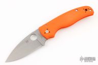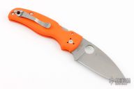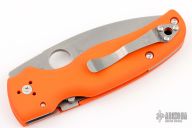 This Shaman PLN by Spyderco features a stonewashed spear point blade with notched thumb and finger rests, thumbhole. The handle has orange G-10 scales, inlaid stainless steel liners and a black stainless steel backspacer, 4-way reversible stainless steel clip, lanyard hole at the butt. Comes with original box and papers. New condition.