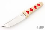 This Mini Tanto Neck Knife by Sam Eddleman features a mirror polished tanto blade with false top edge, .132" blade stock and .801" blade depth. Handle is wrapped in a traditional Japanese style using epoxy soaked nylon cord over rayskin. Comes in a custom black kydex neck sheath. Excellent condition.