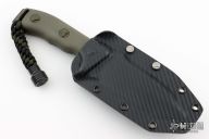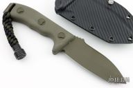 This Currahee by Microtech has a green tanto blade with a standard edge and green polymer scales. 3/16" blade stock and 1 1/2" blade depth, full tang construction. Dated 11/2019 and S/N 5057. Comes with kydex sheath with molle lock and original box. Has a couple sheath scuffs, otherwise excellent condition.