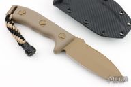 This Currahee by Microtech has a tan tanto blade with a standard edge and tan polymer scales. 3/16" blade stock and 1 1/2" blade depth, full tang construction. Dated 11/2019 and S/N 5096. Comes with kydex sheath with molle lock and original box. Has a couple light sheath scuffs, otherwise excellent condition.