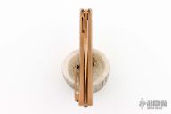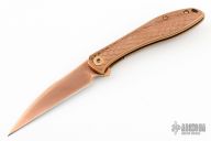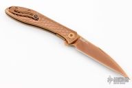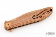 This Mongoose by Jerry Moen features a mirrored and Rose Gold DLC coated blade with notched flipper. The handle has a milled matching DLC coated titanium frame, backspacer and tip up clip with ceramic ball insert, bronze titanium hardware. Has an inlaid titanium liner, rides on bearings, nice detent, lockup and blade seating. Comes with a zippered case and COA. Excellent condition.