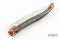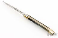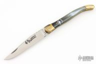 This knife by Laguiole features a satin finished clip point blade with a nail nick and fileworked spine. The handle features brass bolsters/liners over a fileworked steel backspring and buffalo horn covers. Excellent Condition.