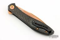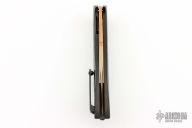 This Mongoose by Jerry Moen features a mirrored and Rose Gold DLC coated blade with notched flipper. The handle has a milled DLC coated titanium frame, backspacer and tip up clip with ceramic ball insert, and Rose gold titanium hardware. Has an inlaid titanium liner, rides on bearings, nice detent, lockup and blade seating. Comes with a zippered case and COA. Excellent condition.
