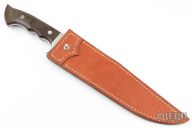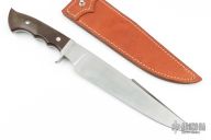 This fixed blade by Tim Steingass features a satin finished blade with a sharpened top edge, notched thumbrest, .271" blade stock and 1.858" blade depth, full tapered tang construction. The handle features a stainless steel guard, green canvas micarta scales with red liners. Includes a brown leather sheath. Has a few very light scratches and a couple small spots on the blade, otherwise excellent condition.