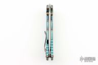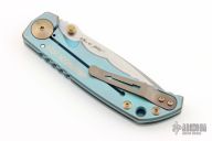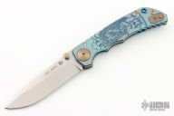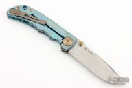 This Harsey framelock folder by Spartan Blades features a stonewash drop point blade with dual thumbstuds and a notched thumbrest. The handle has an anodized titanium frame with laser engraving, a tip up titanium clip and filler tab. Has nice detent, lockup, and blade seating. Comes with original box. Excellent condition otherwise.