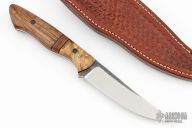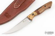 This Bird and Trout by Jarrett Fleming features a satin finished blade with raw bar flats and a full tang construction, .113" blade stock and 1.064" blade depth.  The handle has buckeye burl wood bolsters, Koa wood scales with black canvas micarta pins and orange/black liners, orange/black/ironwood spacers.  Includes a hand tooled brown leather sheath. Excellent Condition.
