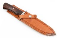 This custom Fighter by Mike Craddock features a hand rub satin finished blade with false top edge, .190" blade stock and 1.455" blade depth, hidden tang construction. The handle has a stainless guard with copper spacer, ironwood handle with a single stainless steel pin. Comes with a hand tooled brown leather sheath by L Parsons. Stunning piece. Excellent condition. Comes with a zippered case.