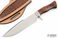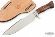 This camp knife by Shawn Knowles features a satin finished blade with sharpened top edge, .254" blade stock and 1.855" blade depth, hidden tang construction. The handle has a stainless steel guard with a curly koa wood grip and a single steel pin and lanyard tube. Custom Kenny Rowe paddle sheath with alligator inlay.  Excellent condition.