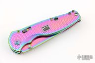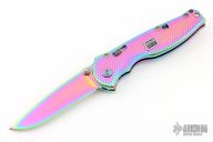 This assisted opening knife by SOG features a rainbow-colored drop point blade with dual thumbstuds.  The handle features a textured anodized aluminum construction with a matching tip up steel pocket clip.  Includes the original box and papers.  Excellent Condition.