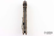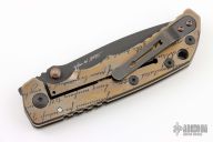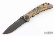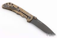 This Harsey framelock folder by Spartan Blades features a black drop point blade with dual thumbstuds and a notched thumbrest. The handle has a bronze anodized titanium frame with a laser engraving a tip up titanium clip and filler tab. Has nice detent, lockup, and blade seating. Comes in a drawstring pouch. Has a couple light scuffs, otherwise excellent condition.