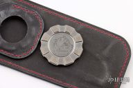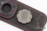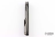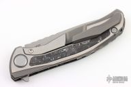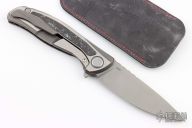 This F95 Hati from Shirogorov has a flat ground tumble finished blade with notched thumbrest and flipper. The handle has a two-tone titanium frame with black/white carbon fiber front scale and inlay, titanium backspacer and tip up clip with hidden screws. Excellent lockup, crisp detent, and perfect seating. MRBS. Comes with Hitex coin, Shiro box marked "F95 plain" and a black leather sheath that holds the knife and coin. Excellent condition.