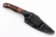 This Custom Ryu by Half Face Blades features a dark stonewashed blade with a fileworked spine, .157" blade stock, 1.014" blade depth, full tang construction. The handle has Kenuti wood bolsters, ironwood scales, black liners, brass spacers and mosaic pins. Comes with a kydex sheath with clip. Excellent condition.