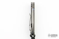 This Small Sebenza Classic by Chris Reeve features a two-tone finished blade with satin grinds and tumbled flats, notched thumbrest and single thumbstud. The handle has a "Retro" Computer Generated Graphic tanium frame with tip up titanium clip and a lanyard hole in pommel. Has some light scratches and scuffs, otheriwse good condition. Comes with original box, leather slip sheath and COA dated March 31, 2008.