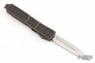 This Makora OTF from Microtech Knives features a satin finished double-edged blade with fullers. The handle is comprised of bronze anodized aluminum with nonslip inserts. Black coated thumb slide, tip down pocket clip and dual glass breakers. Dated 04/2005 and marked 012 of 100 on pocket clip. Has a couple light scuffs on the clip, otherwise excellent condition.