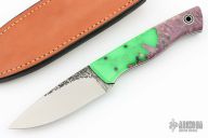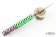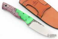 This Bushfinger features a two tone blade with forge finished flats and satin grinds, .126" blade with 1.272" blade depth, full tapered tang construction. The handle has toxic green Shokwood scales, black and white G-10 liners. Comes with a brown leather sheath. Excellent condition.
