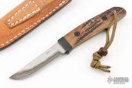 This Belt Knife by Hiroaki Ohta features a hand rubbed satin finished San Mai Damascus blade with Hitachi Blue core, .128" blade stock and .757" blade depth, hidden/frame tang construction. The handle has a black linen micarta guard and frame, stag scales with black pins and a lanyard hole. Comes with a brown leather sheath with kydex inside, has a belt loop. Excellent condition.