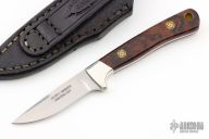 This knife by Alan C Warren features a hand rub satin finished blade with false top edge, .107" blade stock and .616" blade depth, full tapered tang construction. The handle has a nickel silver bolsters, ironwood burl scales with red liners and mosaic pins, lanyard hole. Comes with hand tooled black leather sheath. Has a few light scratches, otherwise excellent condition. #2121