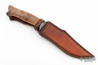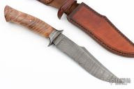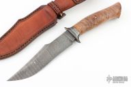 This Fighter from Marcin Bona features a Damascus blade with sharpened top edge, .160" blade stock and 1.466" blade depth, hidden tang construction. The handle has a blued steel guard, ash wood grip with a single nickel silver pin. Includes a brown leather sheath with belt loop. Excellent condition.