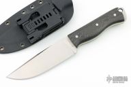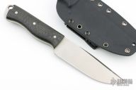 This Magnum Hunter by Christopher (Big Chris) Berry features a satin finished blade with false top edge, .150" blade stock and 1.471" blade depth, full tang construction. The handle has carbon fiber scales with green G-10 liners. Comes with a kydex sheath. Has a few light scratches, otherwise excellent condition.