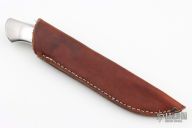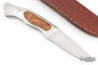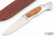 This knife by Master Smith Bailey Bradshaw features a hand rub satin finished blade with an integral handle that has maple burl wood inlays, .118" blade stock and 1.174" blade depth. Comes with a brown leather sheath and a zippered case. Excellent condition.