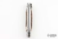 This Lever Lock Auto has a mirror polished stainless steel spear point blade. Handle has horn scales, steel front and rear bolsters, stainless steel liners and a nickel silver lock release button. Has some scuffs and patina, otherwise excellent condition.