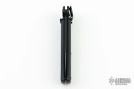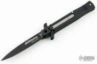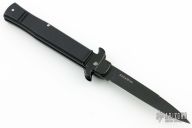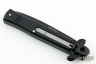 This Leverletto Lever Lock Auto has a black stainless steel spear point blade. Handle has black aluminum scales, black bolsters, stainless steel back spacer. Excellent condition.