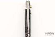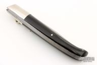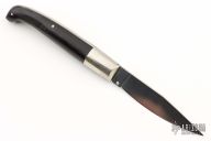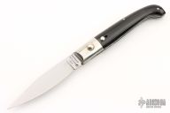 This knife by AGA Campolin features a mirror polished clip point blade. The handle has nickel silver bolsters and button release, horn scales, stainless liners, safety and backspacer. Nice action, nice lockup and blade seating. Excellent condition. Comes with original box, and sheath. Has some light scuffs, excellent condition otherwise.