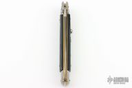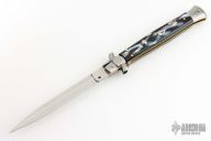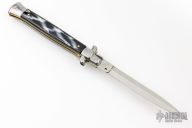 This 11" Swivel Bolster by Frank Beltrame features a flat ground dagger blade. The handle has stainless steel bolsters, front and rear, black/white scales, brass liners, brass pins, stainless spring. Excellent condition.