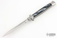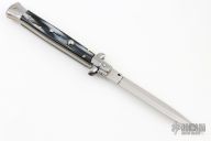 This 11" Swivel Bolster by Frank Beltrame features a flat ground dagger blade. The handle has stainless steel bolsters, front and rear, black/white scales, brass liners, brass pins, stainless spring. Excellent condition.
