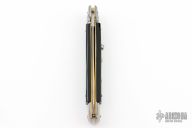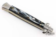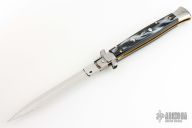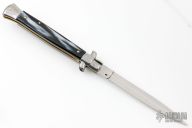 This 11" Swivel Bolster by Frank Beltrame features a flat ground dagger blade. The handle has stainless steel bolsters, front and rear, black/white scales, brass liners, brass pins, stainless spring. Excellent condition.