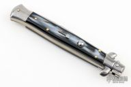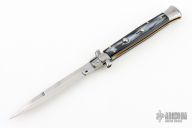 This 11" Swivel Bolster by Frank Beltrame features a flat ground bayonet blade. The handle has stainless steel bolsters, front and rear, black/white scales, brass liners, brass pins, stainless spring. Excellent condition.