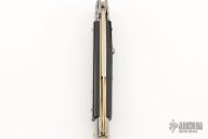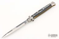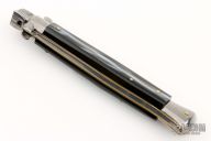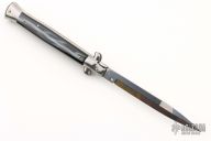 This 11" Swivel Bolster by Frank Beltrame features a flat ground bayonet blade. The handle has stainless steel bolsters, front and rear, black/white scales, brass liners, brass pins, stainless spring. Excellent condition.