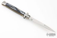 This 11" Swivel Bolster by Frank Beltrame features a flat ground bayonet blade. The handle has stainless steel bolsters, front and rear, black/white scales, brass liners, brass pins, stainless spring. Excellent condition.