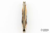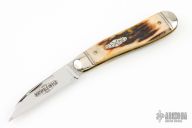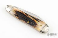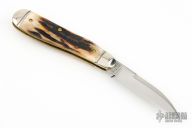 This Houndtooth by Great Eastern Cutlery features a satin finished blade with a nail nick. The handle has nickel silver bolsters and escutcheon, stag covers, brass liners and spring. Has half stop, flush in all positions. Comes with original tube and wax paper. Excellent condition.