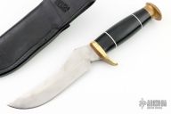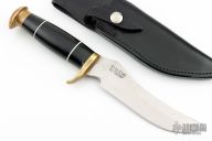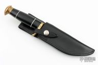 This knife by John Nelson Cooper was made for Bianchi, it features an upswept satin finished blade with notched thumbrest, .236" blade stock and 1.444" blade depth, hidden tang construction. The handle has brass guard and butt, paper micarta grip with white spacers. Comes with a black leather sheath and a zippered case. Has some light patina, otherwise excellent condition.