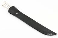 This Short Sword by Jim Ort features a hand rub satin finished blade with fullers, .295" blade stock and 1.315" blade depth, hidden tang construction. The handle has a copper habiki and guard, nickel silver butt with a stacked white/black grip. Comes with a black leather sheath with black skin overlay. Has a few light scratches and patina, otherwise excellent condition.