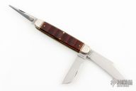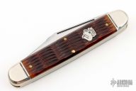 This 3-blade by Great Eastern Cutlery features three satin finished blades with long pulls, nail nicks and false top edges. The handle has fluted nickel silver bolsters, jigged bone covers with nickel silver escutcheon, brass liners, and stainless steel springs. Comes with original tube and wax paper. Has some light scratches, otherwise excellent condition.